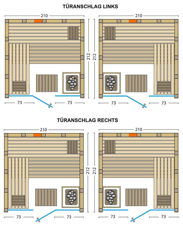 Grundausstattung | 3 Liegen (58 cm breit) 2 Rückenlehnen 2 Kopfstützen Ofenschutzgitter Fußrost Zwischenbankverkleidung Moderner Eckblendschirm "Design" mit Saunalampe (inkl. 4 m Silikonkabel 3 x 0,75 mm²). Glastür: 1920 x 625 x 8 mm, klar, ohne Schwelle, beidseitig verwendbar Glaselement links/rechts: 1940 x 670 x 8 mm, klar, mit Aluschiene Türgriff außen aus Edelstahl, innen aus Buche |