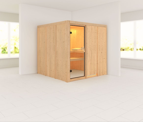 Karibu Sauna Rodin mit Fronteinstieg inkl. Saunatür, Ofenschutzgitter, Kopfstütze und Espenholzbänken. Lieferung je nach Wunsch ohne Ofen oder mit einem 9 kW (integrierte Steuerung), 9 kW (externe Steuerung) oder 9 kW Bio-Kombiofen (externe Steuerung) möglich.