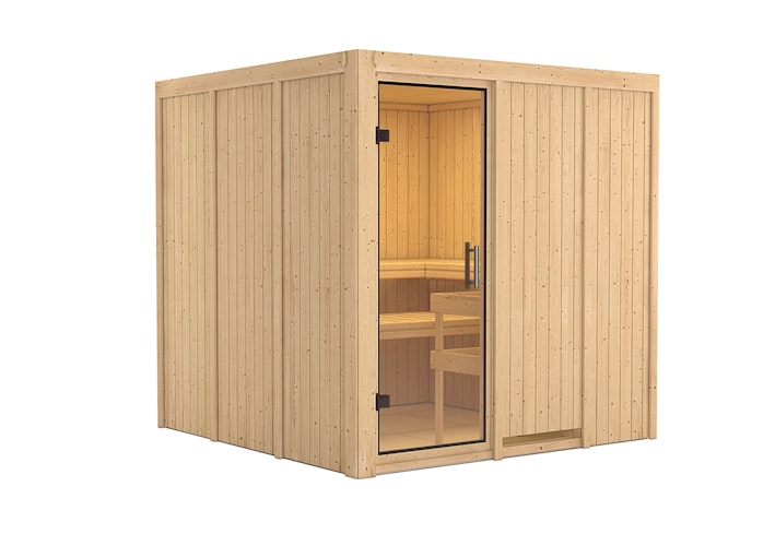 Karibu Sauna Rodin mit Fronteinstieg inkl. Saunatür, Ofenschutzgitter, Kopfstütze und Espenholzbänken. Lieferung je nach Wunsch ohne Ofen oder mit einem 9 kW (integrierte Steuerung), 9 kW (externe Steuerung) oder 9 kW Bio-Kombiofen (externe Steuerung) möglich.