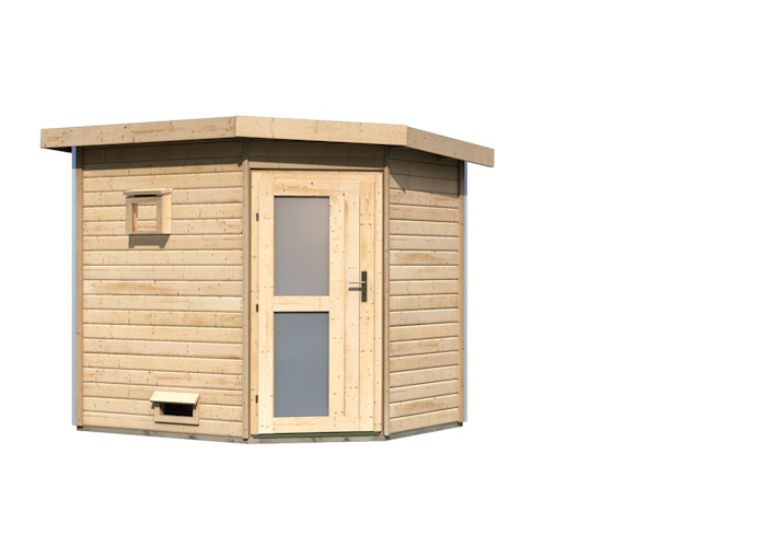 Karibu Gartensauna Pultdach Saunahaus Mikka mit Eckeinstieg naturbelassen